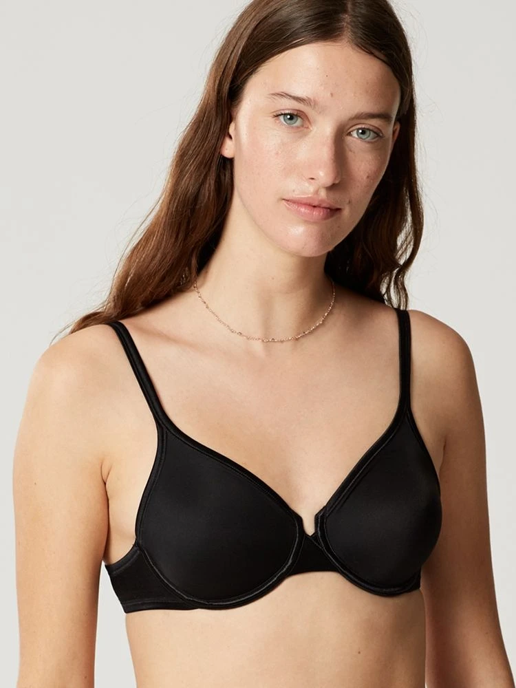Der BH hat ungefütterte, aber ausgeformte Soft-Cups mit Bügel, welche eine glatte Oberfläche haben. Die Cups sind mit einem edel glänzenden, gleichfarbigen Satinband eingefasst. Dieser BH ist besonders leicht und trägt nicht auf. Damit ist er z.B. auch für den Sommer oder als T-Shirt BH geeignet…
