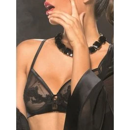 Aus der Kollektion Black Mirror von RCrescentini sind verschiedene, kombinierbare Teile, wie z.B. Slips, Strings, BHs, eine Corsage oder ein kurzer Morgenmantel separat erhältlich.