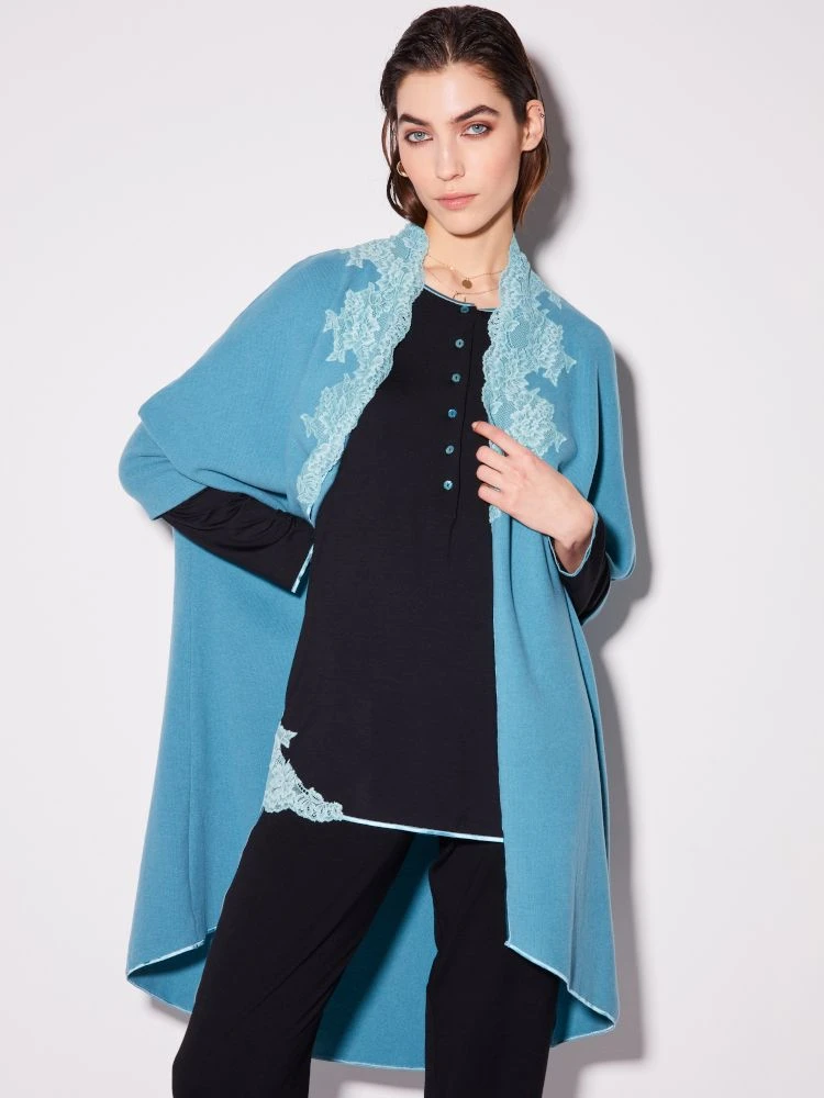 Das Cape Kuschelbaumwolle mit Spitze von Chiara Fiorini besteht aus einer kuschelweichen Baumwollmischung (48% Baumwolle). Es ist Made in Italy und in den Größen 36 bis 46 erhältlich. Das schmuseweiche Homewear Cape ist großzügig geschnitten, hat 3/4 Ärmel und florale Spitzendetails am Kragen.