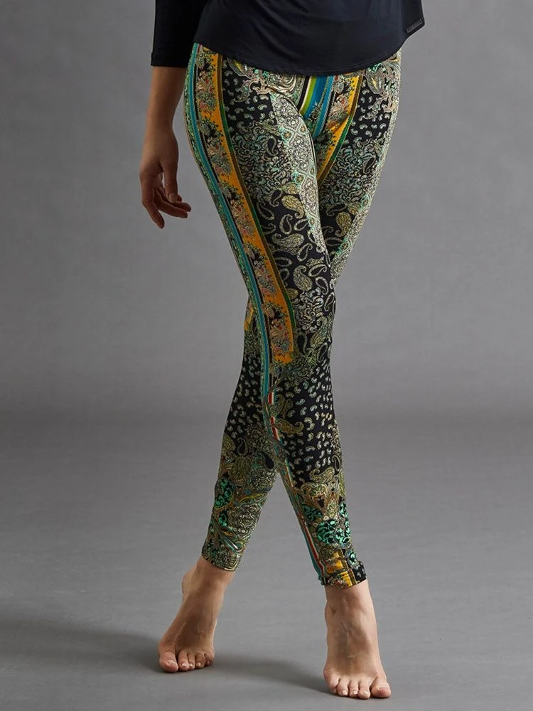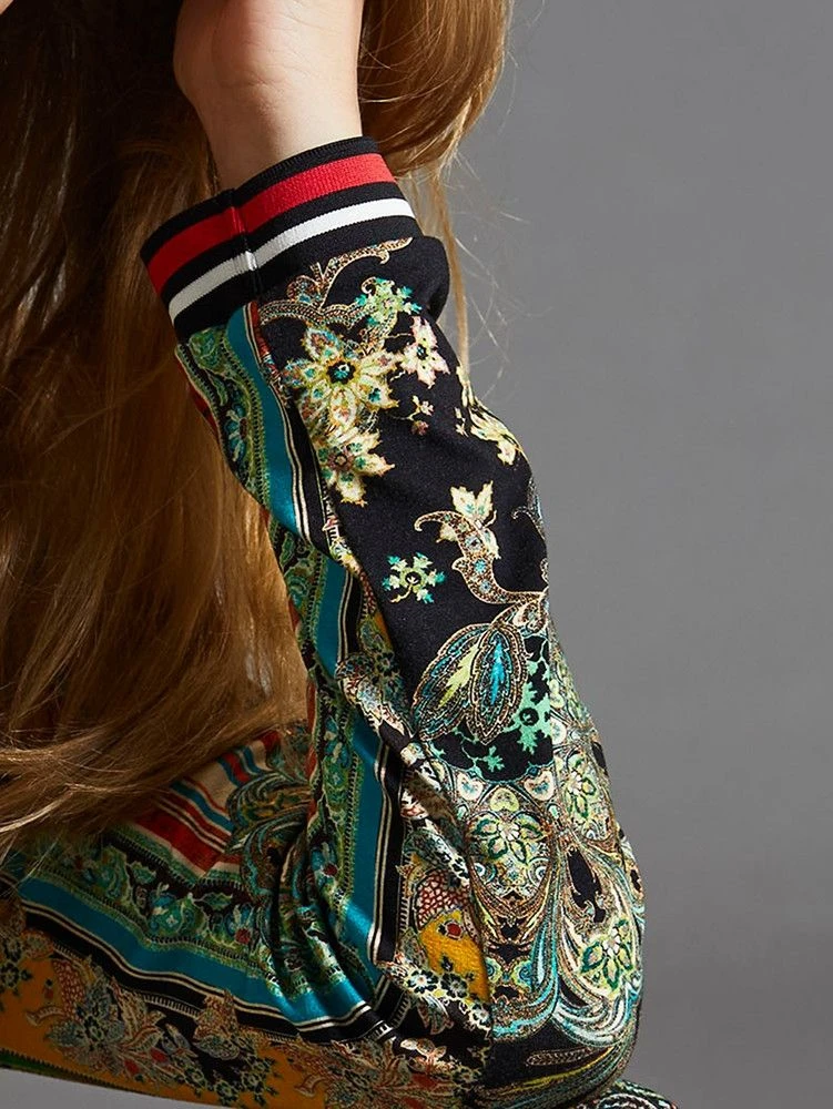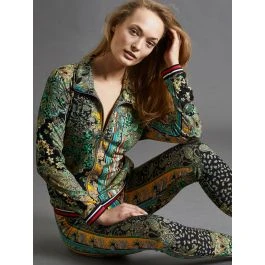 Der Jersey Anzug besteht aus einem besonders feinen und weichen Viscosejersey mit Elasthan, welcher einen exquisiten Druck mit Paisley Muster in den Farben grün, gold und petrol auf schwarz hat. Der Hausanzug ist in den Größen 36 bis 44 erhältlich.