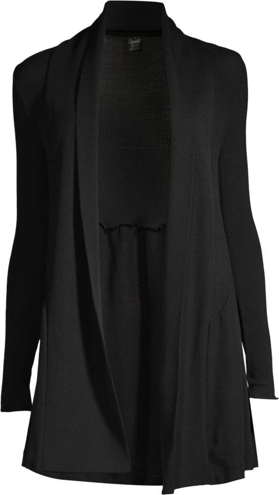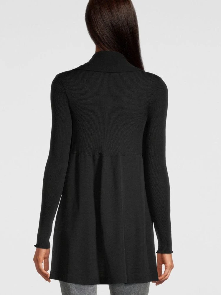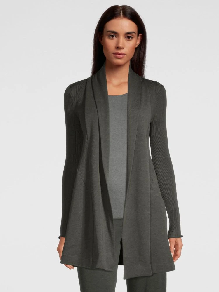 Die Langarm Strickjacke Wolle-Seide besteht aus einem besonderen Materialmix aus geripptem und glatten Jersey aus 70% extrafeiner, tasmanischer Merinowolle und 30% Seide. Dieser edle Cardigan hat einen Reverskragen und die Gesamtlänge ist ca. 80 cm.