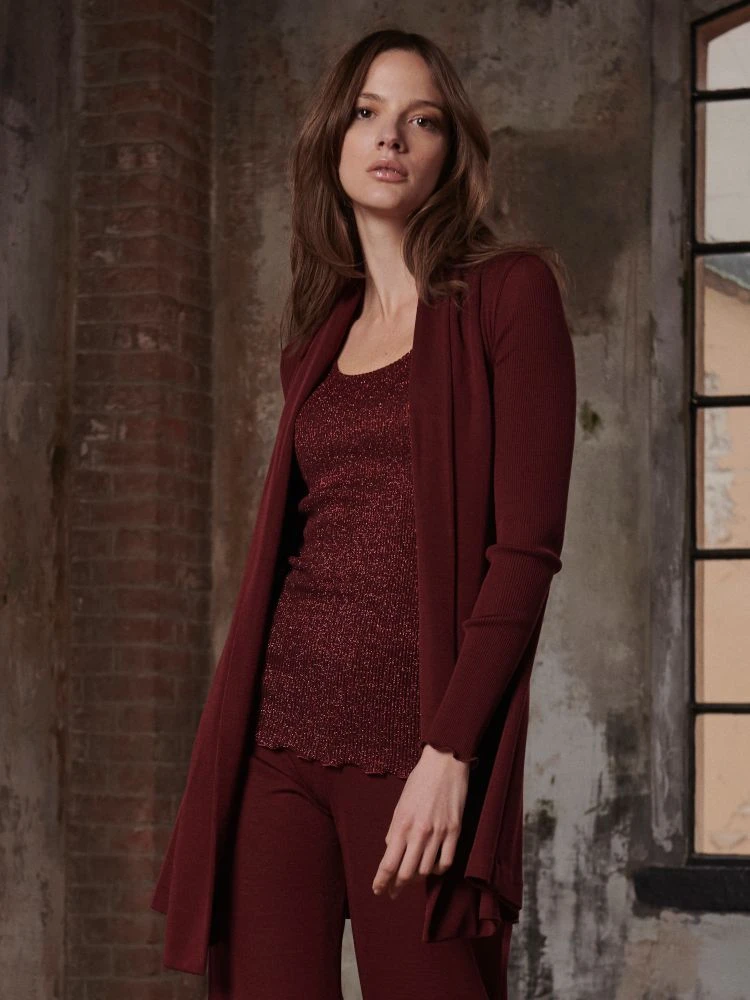 Diese Langarm-Strickjacke ist als Kombination zu Oberbekleidung oder Loungewear geeignet. Da Wolle-Seide Mischungen zusätzlich wie eine Funktionsfaser wirken, kann sie aber auch für Outdooraktivitäten verwendet werden (z.B. beim Wandern). Diese Merino Wolle-Seide Wäsche von Oscalito ist in den italienischen Größen 2 bis 4 erhältlich, wobei die deutsche Größe 38 ungefähr der italienischen Größe 3 entspricht.