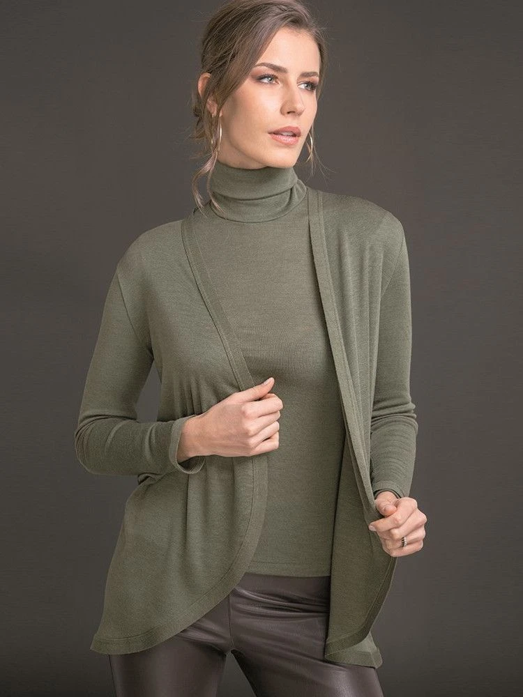 Der Langarm Cardigan Wolle-Seide besteht aus einem besonders hochwertigen Jersey aus 70% extrafeiner Merinowolle und 30% Seide. Diese elegante, leichte Strickjacke hat lange Ärmel, eine Gesamtlänge von ca. 80 – 85 cm und einen leicht assymetrischen Schnitt (hinten länger geschnitten).