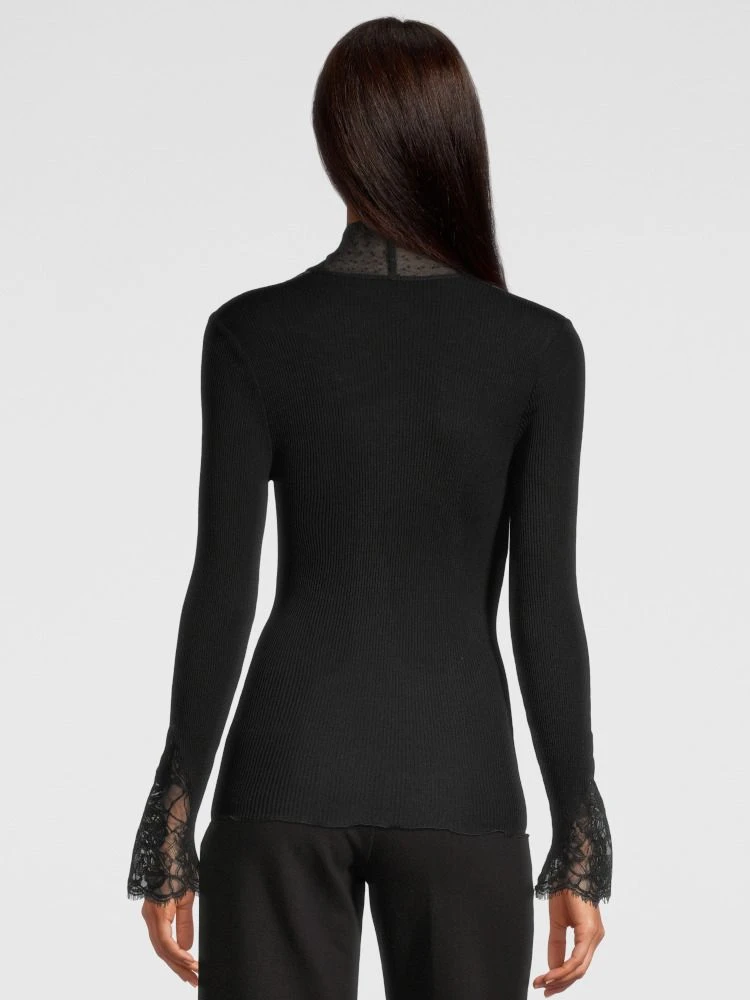 Das Langarm Top Wolle-Seide besteht aus einem besonders hochwertigen gerippten Jersey aus 70% extrafeiner, tasmanischer Merinowolle und 30% Seide in Kombination mit einer exquisiten Spitze aus Calais. Dieses edle Shirt hat einen Kragen kleinen Stehkragen, lange Ärmel, Spitze an den Ärmeln und am Decolleté und eine Gesamtlänge von ca. 62 cm. Der Kragen aus Tüll wird vorne mit einer breiten Schleife aus Tüll geschlossen.