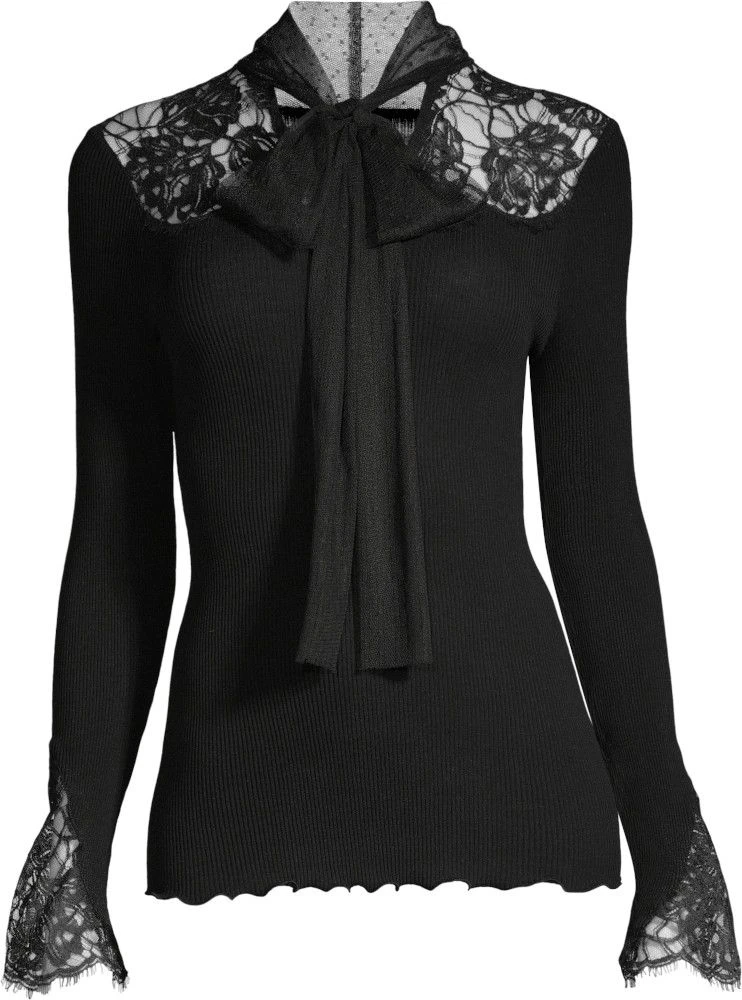 Merinowolle-Seide Langarm-Shirt mit Schleife schwarz von Oscalito