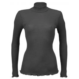Das feine Rollkragen-Shirt Wolle-Seide besteht aus einem besonders hochwertigen, rundgestrickten und gerippten Jersey aus 70% extrafeiner Merinowolle und 30% Seide. Dieses edle Shirt mit langen Ärmeln ist ca. 60 cm lang. Der untere Saum und die Ärmelenden sind wellig umkettelt. Das Shirt hat einen hohen Rollkragen, den man auf der gewünschten Höhe umschlagen kann. Das Material ist eine rundgestrickte „Schlauchware“ und daher ist dieses Shirt seitlich nahtlos.