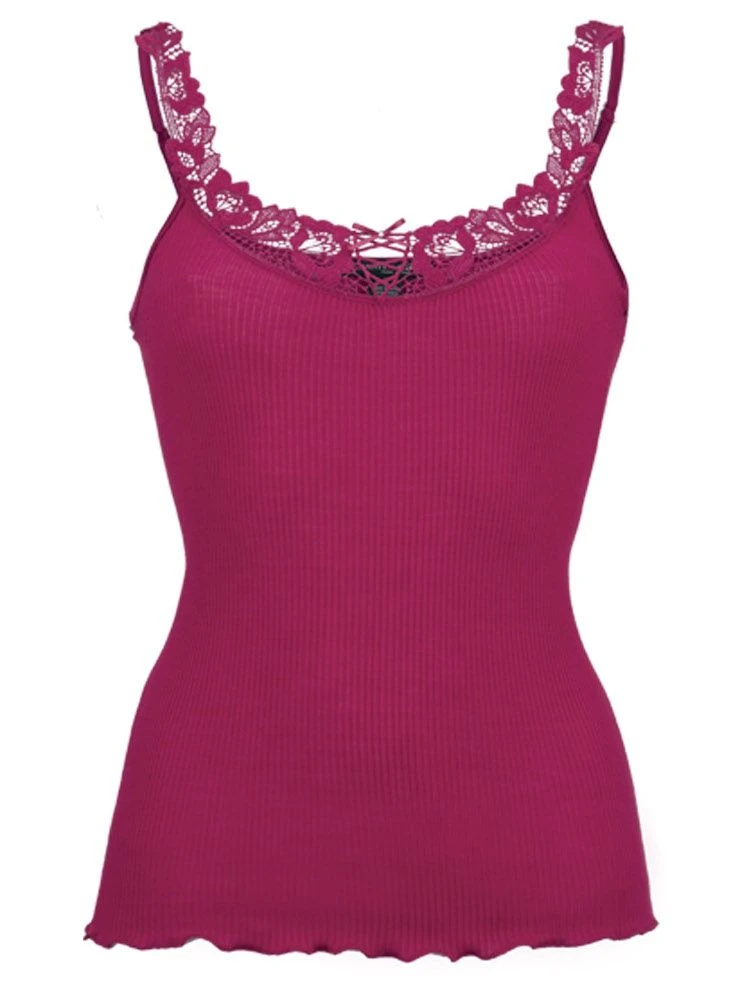 Das feine Träger-Top Wolle-Seide besteht aus einem besonders hochwertigen, rundgestrickten und gerippten Jersey aus 70% extrafeiner Merinowolle und 30% Seide. Dieses edle Shirt mit verstellbaren Trägern ist ca. 60 cm lang. Der untere Saum ist wellig umkettelt. Am Ausschnitt ist dieses Shirt mit einer exquisiten Spitze aus der Schweiz gearbeitet. Das Material ist eine rundgestrickte „Schlauchware“ und daher ist dieses Shirt seitlich nahtlos.
