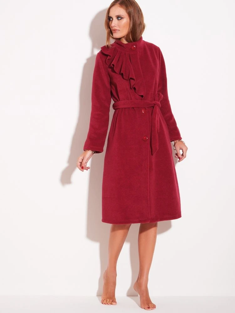 Dieser Morgenmantel mit langen Ärmeln wird mit großen Knöpfen zugeknöpft und kann zusätzlich mit einem Bindegürtel tailliert werden. Er ist in der Farbe himbeere oder dunkelblau erhältlich und ca. 105 cm lang. Er hat einen Bindegürtel, Taschen, lange Ärmel und ist am Ausschnitt wellig geschnitten. Dieser wärmende Morgenmantel ist optimal für die Übergangszeit und im Winter.