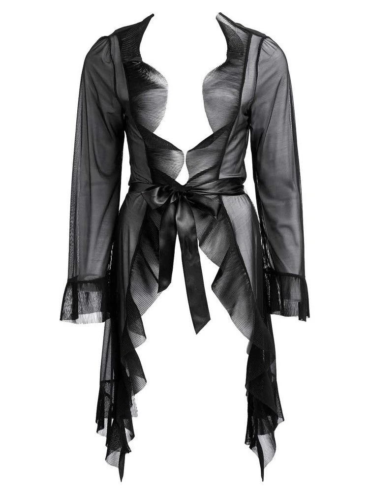 Dieser Morgenmantel ist komplett aus feinem, transparenten Tüll gearbeitet. Er wird gewickelt getragen und mit einem Satin Bindegürtel geschlossen. Die Enden der langen Ärmel, der Saum und das Revers sind mit einem weichen Rüschensaum aus Plisseefalten-Tüll benäht. Die Gesamtlänge ist ca. 95 cm und der Mantel ist komplett transparent und am Ärmel ist ein goldenes Escora Schlüsselchen Schmuckelement angebracht.