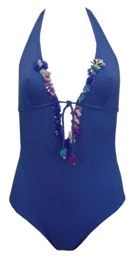 Der Neckholder Badeanzug Houston von Exilia besteht aus abend-blauem, superweichem Feinjersey, und ist mit besonders reichen Applikationen verziert. Das tiefe Decolleté kann über ein Bindebändchen reguliert werden. Die Cups sind doppelt gearbeitet, aber ungefüttert und passen etwa für Körbchengröße B bis C.