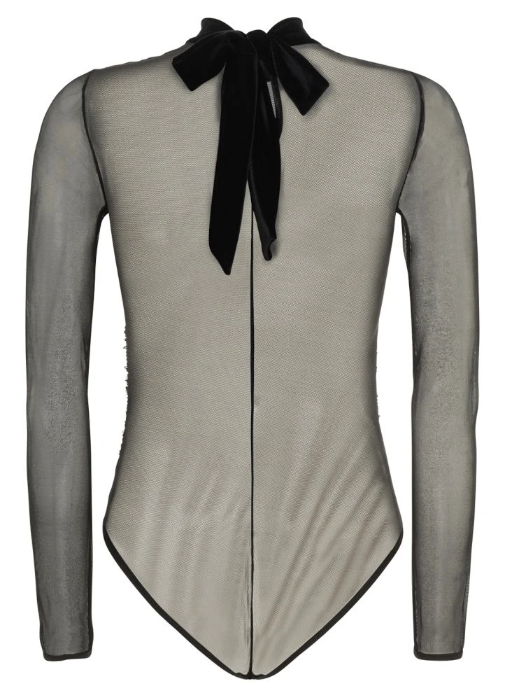 Dieser glamouröse Langarm Body ist vorne mit schwarzen Pailletten verziert. Er besteht komplett aus schwarzem Tüll. Hinten ist der Tüll ohne Paillettenbesatz und somit transparent. Der Body hat lange Ärmel und einen Kragen aus Samt, der hinten als Schleife gebunden wird. Im Schritt ist er mit Knöpfchen zu öffnen.