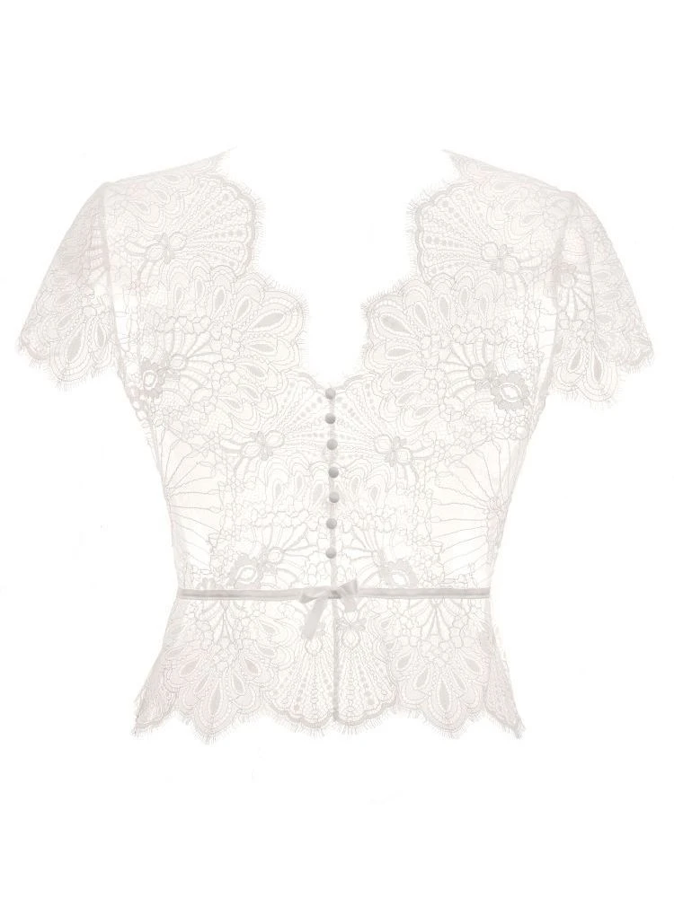Dieses Top aus Spitze hat kurze Ärmel und eine Länge von ca. 50 cm. Seitlich ist ein Reißverschluss angebracht und auf der Rückseite befindet sich eine dekorative Reihe von Satin-bezogenen Zierknöpfen und eine kleine Schleife aus Satin. Ergänzende Teile sind in unserem Shop separat erhältlich.