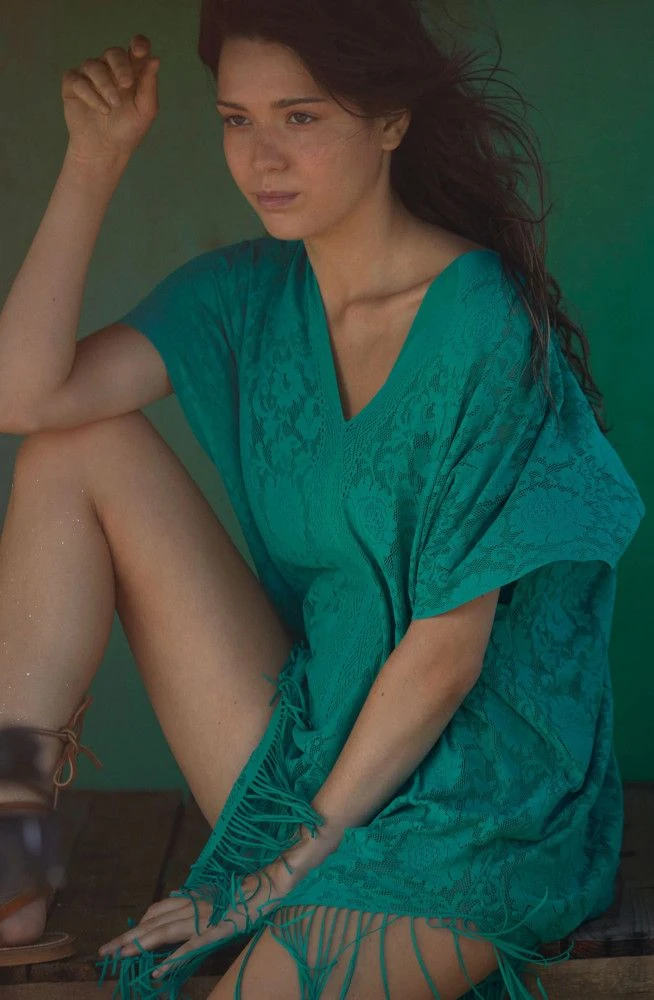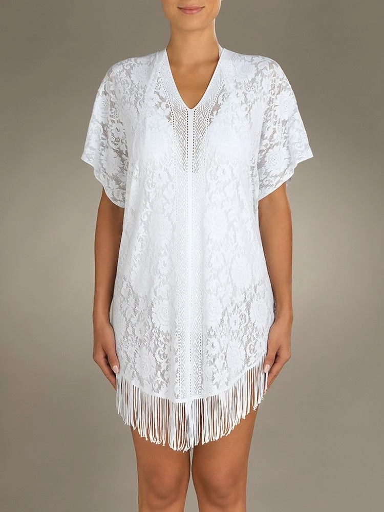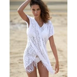 Die Strand Tunika Jesse 20 von Pain de Sucre ist ein praktisches Kombi-Teil aus weicher, floraler Spitze. Diese modische Beachwear aus Frankreich ist ein praktisches Strand Accessoir in strahlendem Sommer-Weiß. Die Strand Tunika besteht aus schnell trocknender Spitze mit Blumenmuster und hat Fransen am unteren Saum. Sie ist ärmellos geschnitten, mit V-Ausschnitt und ca. 88 cm lang.