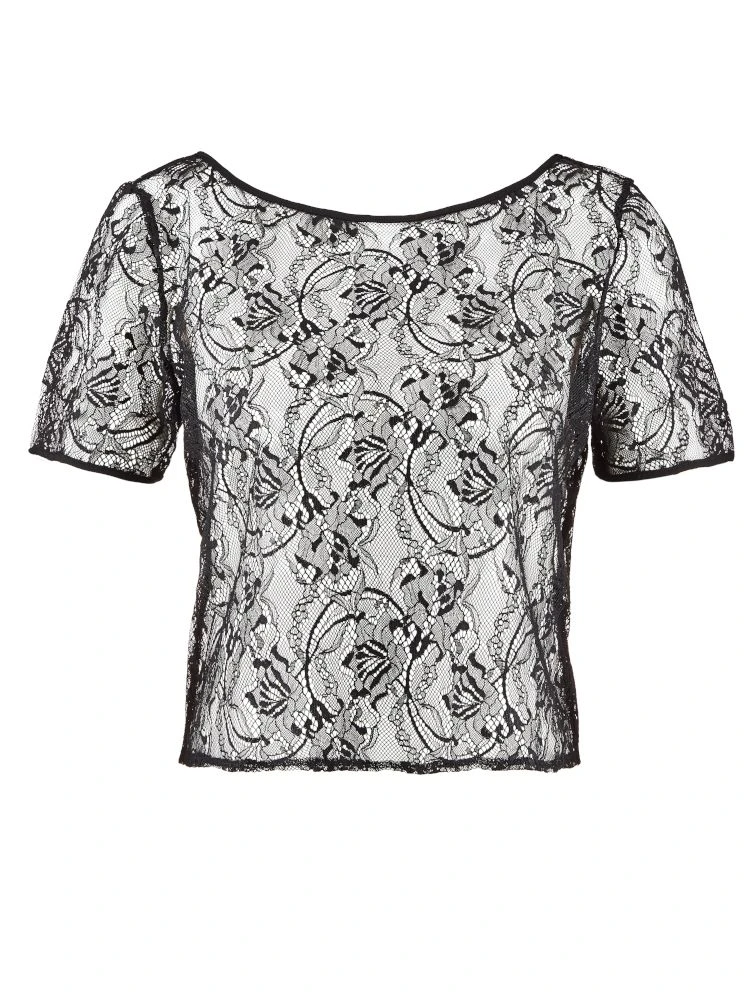 Das elegante Spitzentop hat einen runden Ausschnitt, kurze Ärmel und geht mit 48cm etwa bis zur Taille. Der semitransparente Stoff lässt die Haut durchschimmern und enthüllt sie auf sinnliche Weise. Der kastige Schnitt vereint mit der zarten Spitze macht aus diesem Top eine gelungene Kombination aus aufregender Modernität und stilvoller Klassik.