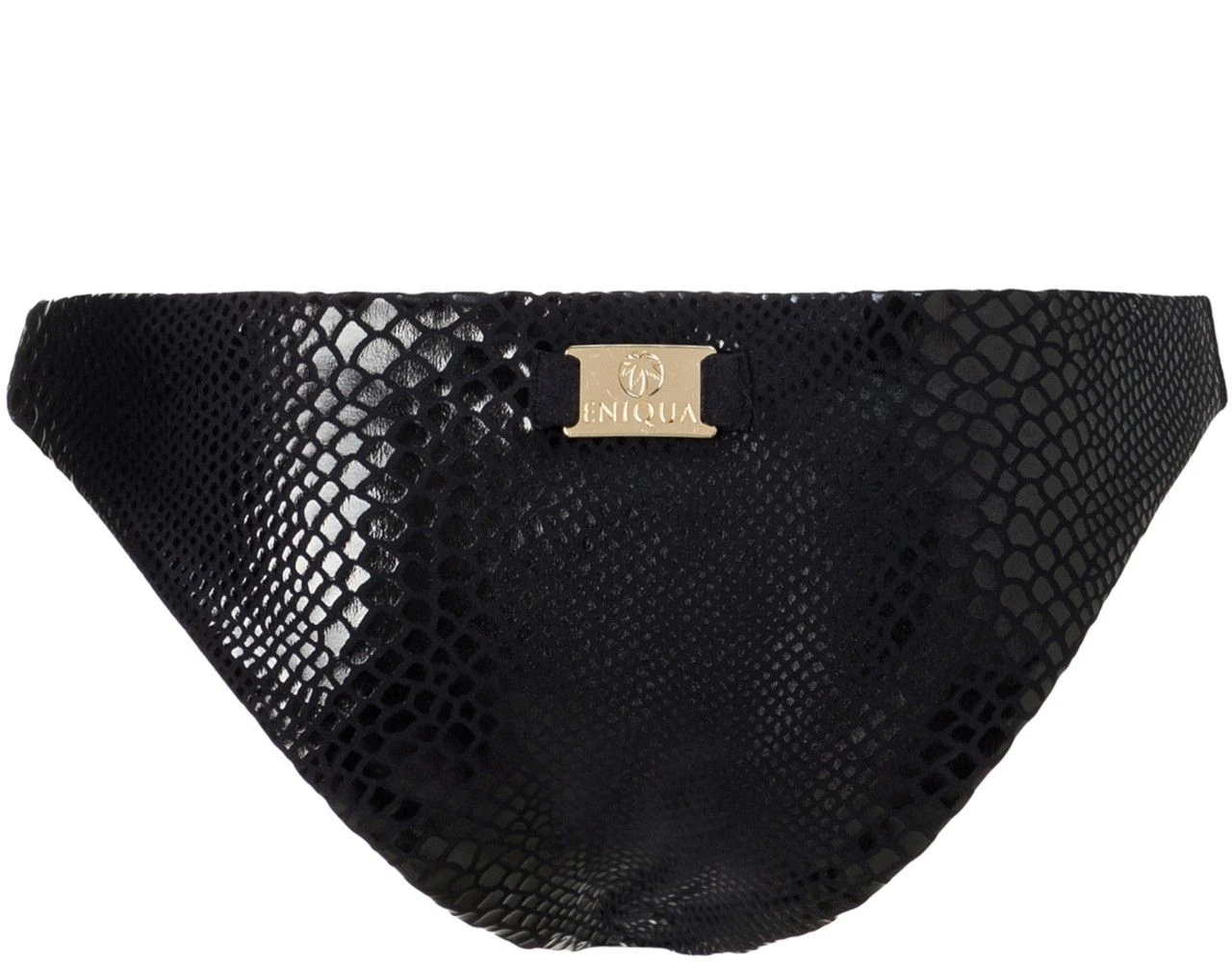 Der Triangel Bikini Black Mamba ist luxuriöse Bademode von Eniqua. Die Bademode der schweizer Beachwear Marke Eniqua verführt mit besonders modischen Entwürfen und hochwertigen Materialien. Dieser hochwertige Bikini hat einen schwarz glänzenden Schlangen-Optik Druck auf einem weichen, schnell trocknenden Microfaserjersey und ist kombiniert mit goldenen Schmuckelementen aus Metall.