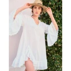 Das kurze Tunikakleid Bianco mit weitem Schnitt von Fiori di Chiara besteht aus feiner Baumwolle in einer leichten Mousselin Qualität (100% Baumwolle). Es ist Made in Italy und in in den Größen 36 bis 44 erhältlich. Ausverkaufte Größen sind hier nicht nachbestellbar. Die Tunika hat einen leicht assymetrischen Saum mit Rüschen Volants. Sie ist mit Häkelspitze und Fransen verziert und hat halblange Ärmel.