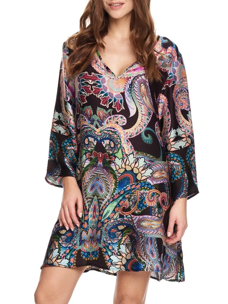 Die Tunika mit 3/4 langen Ärmeln von Gattina besteht aus 100% Viscose in einer fließend fallenden Satin-Qualität. Sie hat einen Paisley Druck und ist in in den Größen 38 bis 48 (deutsche Damenkonfektionsgrößen) erhältlich. Ausverkaufte Größen sind hier nicht nachbestellbar. Dieses Longshirt mit einer Gesamtlänge von ca. 85 cm kann als Nachthemd, Sommerkleid oder Strandkleidung getragen werden.