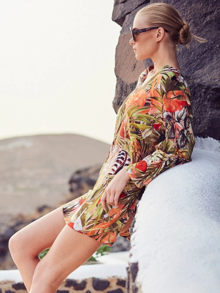 Sommerliche Strand-Tunika Zebra in Paradise mit langen Ärmeln. Diese luftige Tunika ist aus bedrucktem Viscose Batist gefertigt und ist perfekt für sommerliche Temperaturen… Die Tunika hat lange Ärmel und eine Länge von ca. 85 cm. Der legere Schnitt und der exklusive Druck machen diese Tunika zu einer edlen Sommerbluse oder zu einem lässigen Strand-Accessoir. Sie ist etwas länger als eine gewöhnliche Bluse geschnitten und daher auch als Schlafshirt verwendbar.